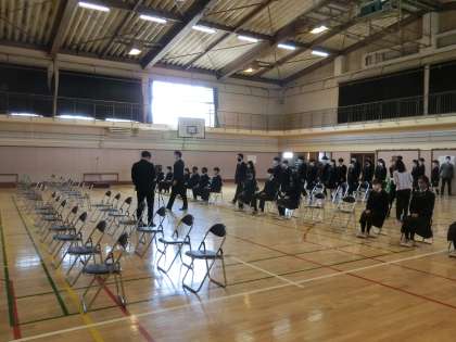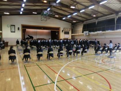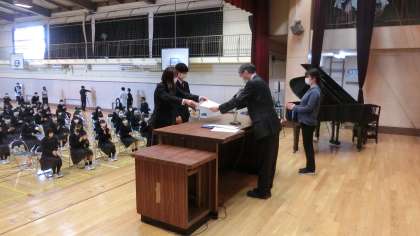 本日の午後、19日の卒業式にむけて予行がありました。3学年全員と2学年の代表生徒、生徒会役員で式の一連の流れを確認しました。緊張感を持ちながら臨むことができました。予行後は、体育優良生徒、産業教育奨励賞生徒、健康努力生徒の表彰が行われました。