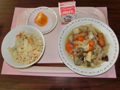 3月17日の給食のメニューは「鯛めし、筑前煮、せとか、牛乳」です。