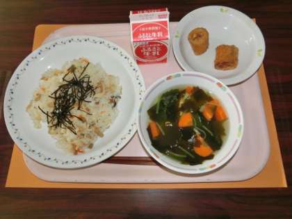 4月8日の給食のメニューは「五目ずし、すまし汁、いかのかりん揚げ、牛乳」です。