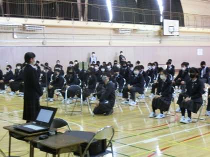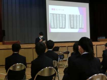 生徒会の活動、各委員会の活動紹介、各部の活動についてなど、短い準備期間でしたが、わかりやすく映像などにまとめられていました。1年生の代表生徒からのお礼の挨拶もとても立派にできました。