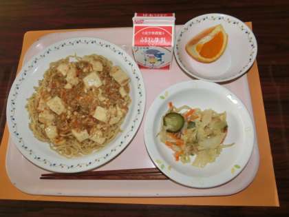 4月13日の給食のメニューは「マーボー麺、白菜の中華サラダ、清見オレンジ、牛乳」です。