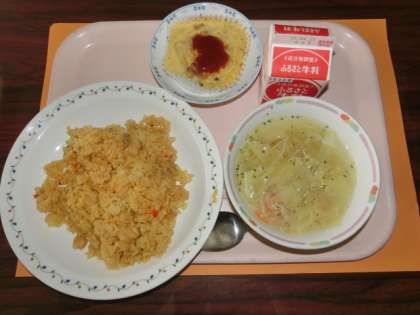 4月14日の給食のメニューは「パエリア、野菜スープ、スペイン風オムレツ、牛乳」です。