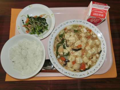 4月19日の給食のメニューは「ごはん、豆腐の五目うま煮、ナムル、牛乳」です。