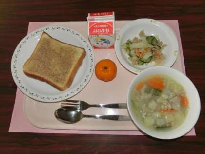 5月17日の給食のメニューは「セサミトースト、田舎風豆スープ、ツナサラダ、冷凍ミカン、牛乳」です。