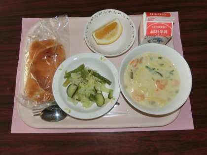 5月19日の給食のメニューは「ダイスチーズパン、シシリアン、アスパラサラダ、美生柑、牛乳」です。