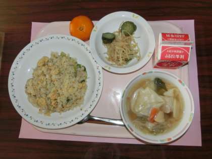 6月7日の給食のメニューは「レタスチャーハン、ワンタンスープ、冷凍みかん、きゅうりともやしのごま酢和え、牛乳」です。