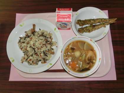 6月9日の給食のメニューは「ひじきごはん、いなか汁、ししゃもの磯辺揚げ、牛乳」です。