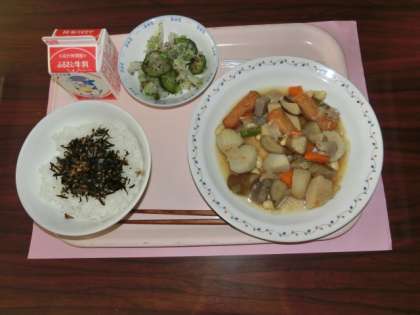 6月15日の給食のメニューは「ごはん、ひじきふりかけ、豆入り筑前煮、ゆかり和え、牛乳」です。