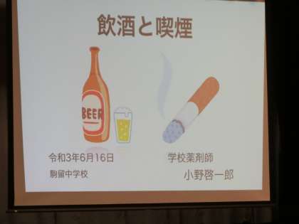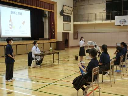 6月16日5時間目に、学校薬剤師の先生を講師にお迎えして、飲酒喫煙防止教室を行いました。実際の健康への影響などを映像で見ることであらためて、未成年の飲酒喫煙が体に与える悪影響について学ぶことができました。