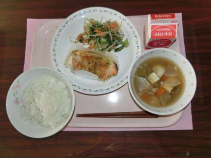 6月18日の給食のメニューは「ごはん、けんちん汁、鮭のちゃんちゃん焼き、ごま和え、牛乳」です。