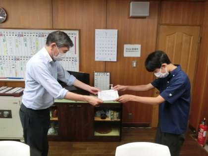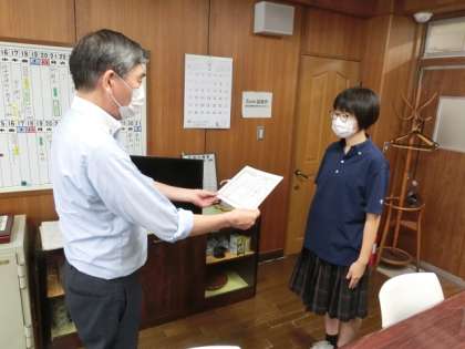 生活委員会主催で行われた「生活標語コンクール2021」の各部門で駒留中学校長賞を受賞した生徒の表彰を6日の昼休み校長室にて行いました。