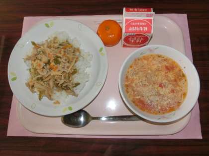 7月14日の給食のメニューは「チンジャオロース丼、卵とトマトのスープ、冷凍みかん、牛乳」です。
