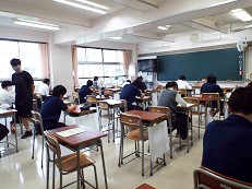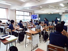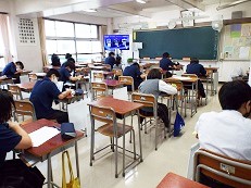 9月3日(金)1校時 総合 職場訪問に向けて「自己紹介カード」を書いています。半数の生徒はリモートで自宅から参加しています。内容がしっかりしていて感心しています。下書きのあと教員の校正を経て清書です。9月10日完成予定です。