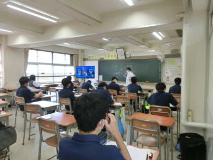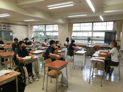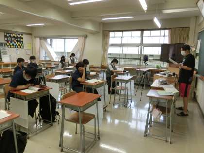 今日から分散登校とオンライン授業が始まりました。朝は登校した生徒の出席確認と同時に、自宅からTeamsに接続した生徒の確認を行いました。また、全員の体調確認をロイロノートで行いました。いくつも確認を先生たちはしなければなりませんが、みなさんの協力のおかげでおおむねスムーズに確認することができました。教科の授業も始まりました。黒板などが教室にいても自宅にいても見えるようにして授業を行っています。教室の中はさみしい感じもしますが、場所は違っていてもみんなで同じ方向に向かってしっかり授業に臨んでほしいと思います。(写真は、3年生の学活や授業の様子です。)