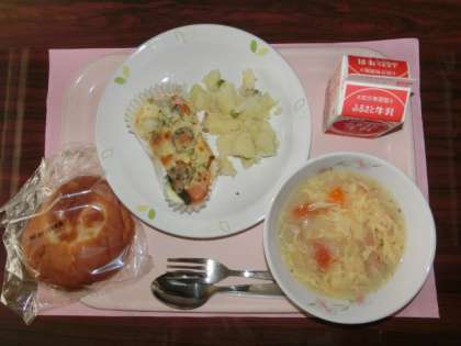 9月7日の給食のメニューは「パインパン、魚のマヨネーズ焼き、ジャーマンポテト、卵とトマトのスープ、牛乳」です。