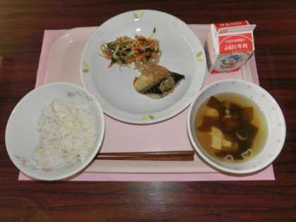 9月9日の給食のメニューは「麦入りごはん、すまし汁、魚のごまだれがけ、おひたし、牛乳」です。