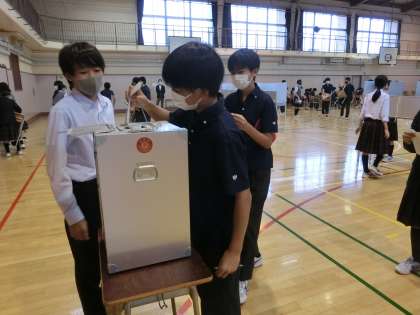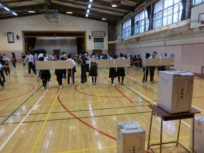 立会演説会を終えてすぐに投票が行われました。1,2年生は体育館で、3年生は指定された教室で投票を行いました。選挙管理委員が見守る中、順番に投票を行いました。