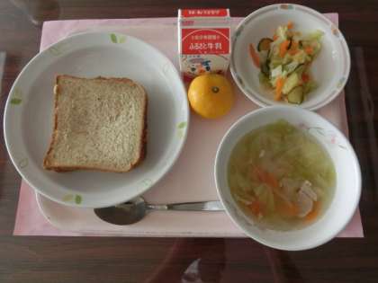 10月5日の給食のメニューは「ツナピザトーストサンド、ひよこ豆のスープ、フレンチサラダ、みかん、牛乳」です。