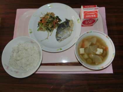 10月6日の給食のメニューは「麦入りごはん、魚の香味焼き、ごま和え、けんちん汁、牛乳」です。
