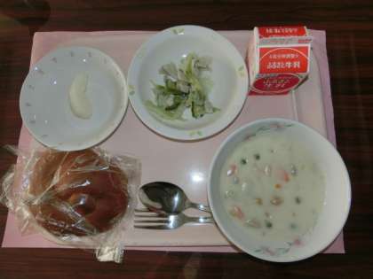 10月11日の給食のメニューは「ココアパン、クリームシチュー、ハムサラダ、なし、牛乳」です。