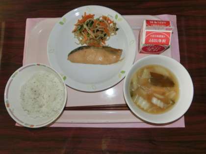 10月13日の給食のメニューは「ごま入りごはん、鮭のみそマヨネーズ焼き、からし和え、みそ汁、牛乳」です。
