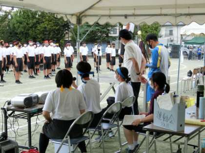 本番に向けた様々な確認を行いながら、予行も閉会式を行うところまできました。トラック外でも各係が真剣に取り組みました。うまくいったところ、そうでないところ、19日(火)の本番に向けて振り返りを行います。参観にお越しいただいた2年生保護者の皆さま、受付ほか係を担当していただいたPTAの皆さま、ありがとうございまいた。本番も天気がよいことを願っています。