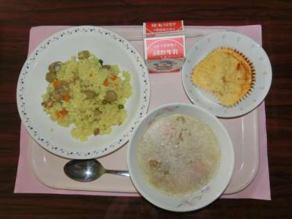 10月19日の給食のメニューは「メキシカンピラフ、ベーコンと野菜のスープ、チーズ入りオムレツ、牛乳」です。