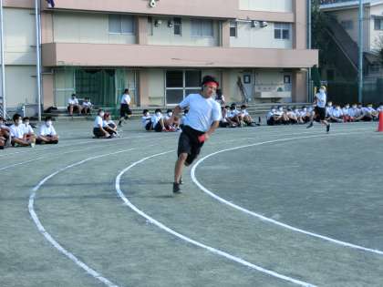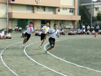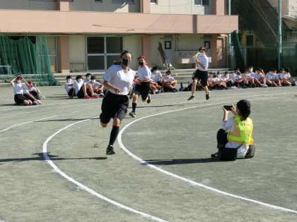 はじめに女子の競技、続いて男子の競技を行います。1年→2年→3年の順で走りました。学級の精鋭4名によるトラック上での最後の競技です。