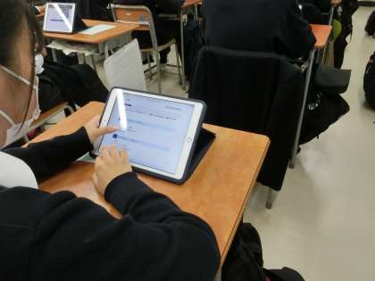 1年生が移動教室に行っている間、授業をしっかり受けて留守を守っている2・3年生。3年は今日と明日に分けて、「児童・生徒の学力向上を図るための調査」を行っています。今日は2クラス行い、明日1クラス行います。iPadを使い、質問に答える形で調査を行います。今日行ったクラスは、調査をする手順を先生から聞き、スムーズに調査を実施することができました。