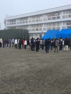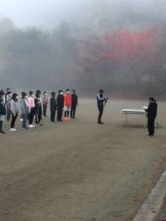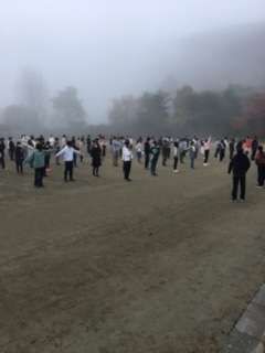 2日目の朝は朝会とラジオ体操で始まりました。園庭には、朝会中も霧が立ち込めています。