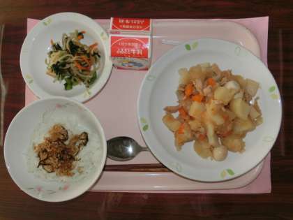 11月8日の給食のメニューは「ごはん、カミカミ佃煮、肉じゃがうま煮、おひたし、牛乳」です。