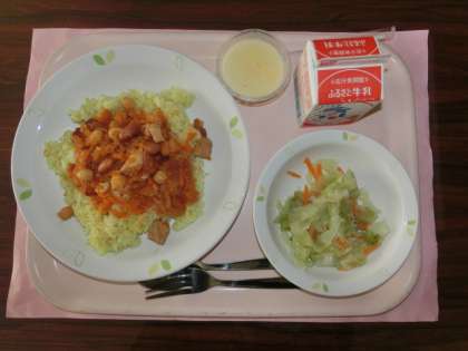 11月12日の給食のメニューは「バターライス、フェイジョアーダ、オニオンサラダ、プジン、牛乳」です。