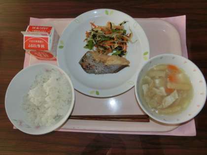 12月2日の給食のメニューは「ごはん、さわらのしょうが風味焼き、野菜ののり和え、豆腐汁、牛乳」です。