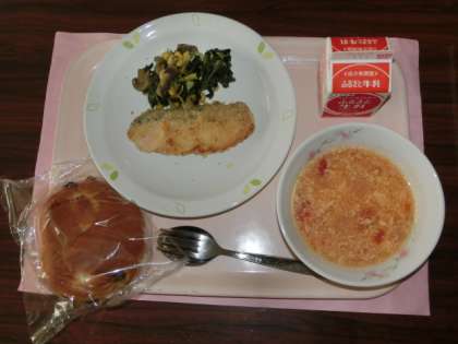 12月8日の給食のメニューは「ぶどうパン、魚のパン粉焼き、ほうれん草とコーンのソテー、卵とトマトスープ、牛乳」です。