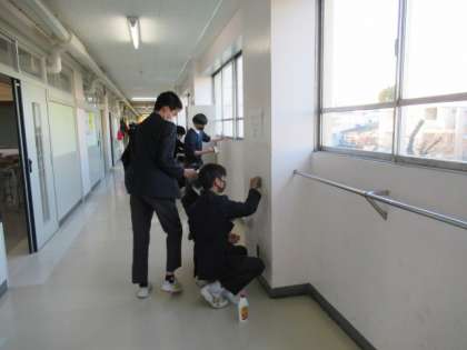 12月9日(木)放課後に整美委員会の呼びかけでボランティア清掃が行われました。整美委員を中心に北校舎の廊下の壁の清掃を積極的に行ってくれました。参加してくれた人たちに感謝します。綺麗になった校舎をみんなで大切に使っていきたいですね。