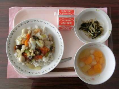 12月13日の給食のメニューは「中華丼、もやしとわかめのごま酢和え、フルーツ白玉、牛乳」です。