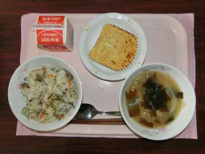 2月10日の給食のメニューは「昆布ごはん、千草焼き、みそ汁、牛乳」です。