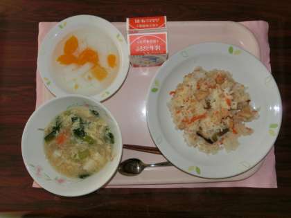3月3日の給食のメニューは「かにちらし寿司、かきたま汁、フルーツ入り杏仁豆腐、、牛乳」です。