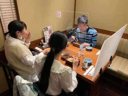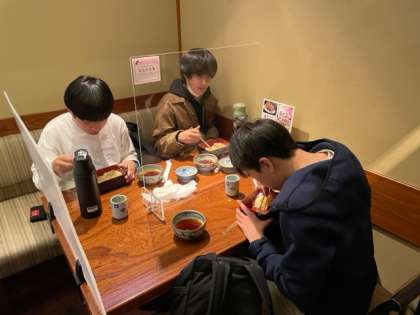 お待ちかねの昼食の時間です。峰本小町通り店で、班ごとに食べました。
