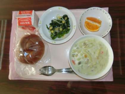 3月4日の給食のメニューは「黒砂糖パン、ハムとホタテのクリーム煮、ほうれん草のサラダ、デコポン、牛乳」です。
