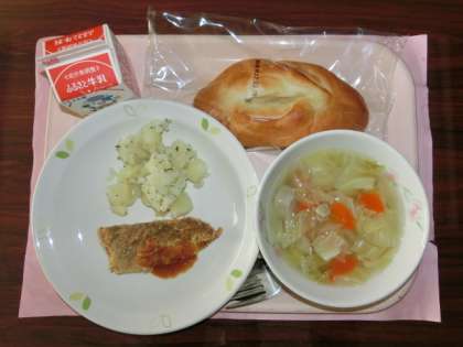 3月11日の給食のメニューは「ソフトフランスパン、魚のプロバンス風、粉ふき芋、ガルビュール、牛乳」です。
