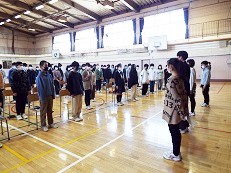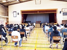 3月12日(土)1校時 総合 進路が決定した3年生がその体験を話してくださいました。下級生から、勉強時間についてなど活発に質問も出ていました。メモを取りながら一生懸命に聴いていました。