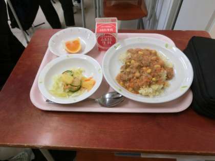 メニューは、野菜サラダ、キーマカレー、柑橘、牛乳です。暑くなり牛乳が美味しいですね。