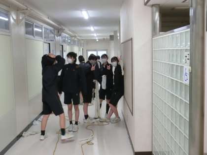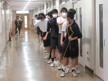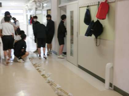 5月14日(土)、本日は雨のため全校練習が中止になりました。3年生は廊下を使用して学年種目の大百足の縄の調整などを行いました。来週の本番に向けて頑張っています。