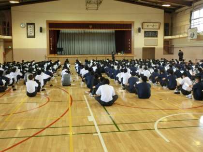 6月11日に体力測定が予定されています。1年生の河口湖移動教室の関係で、8日水曜1校時に全校生徒向けに説明会を行いました。皆、静かに説明を受けていました。