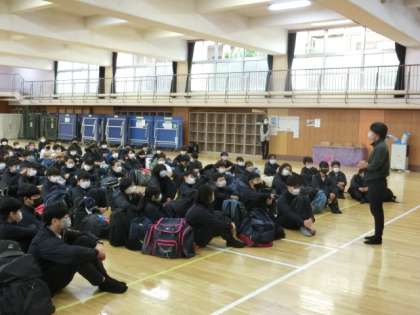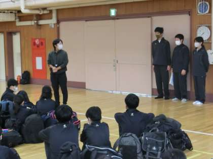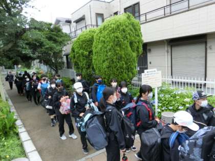 格技室で出発式が行われました。その後緑道を通りバスに乗車です。