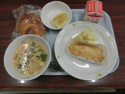 メニューは、ミルクパン、魚のパン粉焼き、コーンポテト、卵とトマトのスープ、河内晩柑、牛乳です。1年生は河口湖移動教室でお弁当を食べている頃ですね。