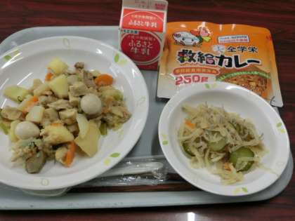 メニューは救急カレー、五目うま煮、大根とジャコのサラダ、牛乳です。