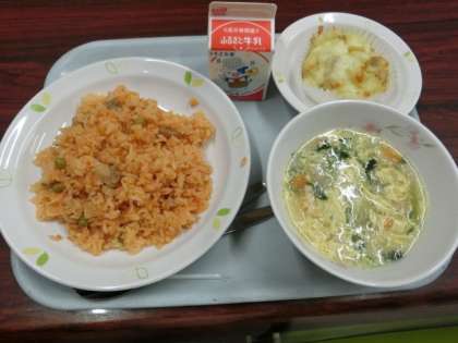 メニューはチキンライス、ポテトのチーズ焼き、卵と青菜のスープ、牛乳です。