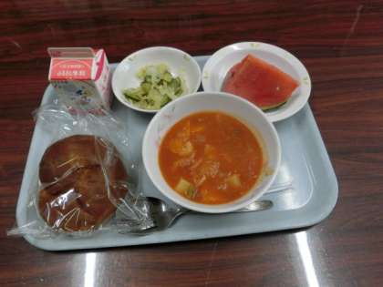 メニューは牛乳、黒糖パン、ハンガリアンシチュー、オニオンサラダ、スイカです。